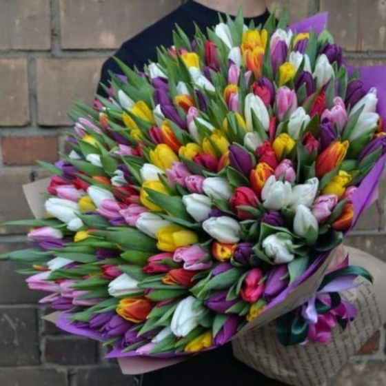 Состав Тюльпан сортовой - 201 шт. Упаковка дизайнерская - 6 шт. Лента атласная - 2 шт.