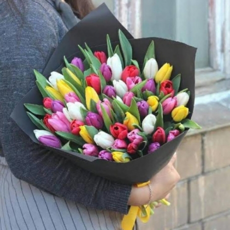 Состав Тюльпан микс - 51 шт. Упаковка дизайнерская - 2 шт. Лента атласная - 1 шт