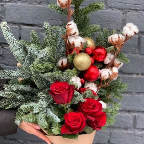 Нобилис 4шт, хлопок натуральный 2 ветки, шары 7шт, роза красная 5