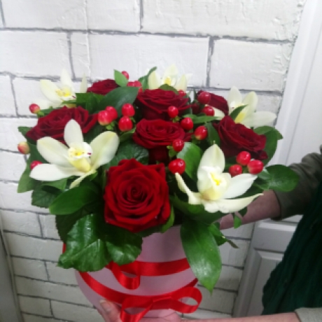 Роза 7, Цимбидиум 5, Хиперикум, Рускус пучок, коробка, лента атласная 2,